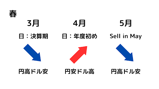また、日本では4月から5月にかけてのGW、海外ではイースターなど、大きな休みが多くあるので流動性が下がり、ちょっとしたきっかけで相場が荒れることもあるので注意が必要です。