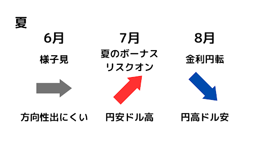 ですが7月前半には夏のボーナスが入り、長期休暇前のリスクオンの買い相場でもあるということで、円安傾向になるとも言われています。