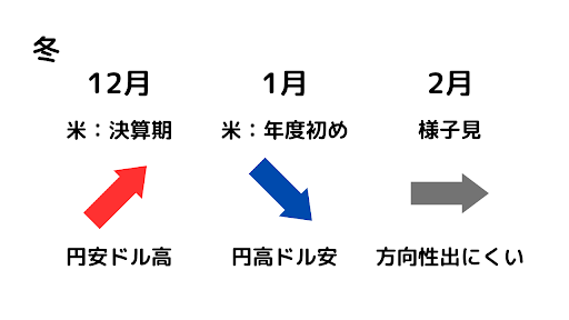 始めに12月はアメリカの本決算期で、外貨をドルに変えるので円安ドル高になりやすいです。