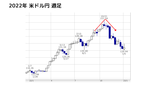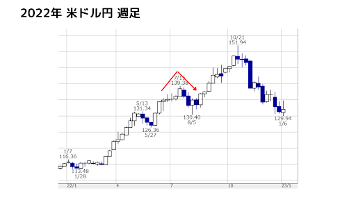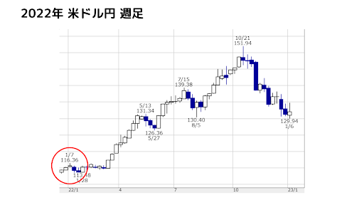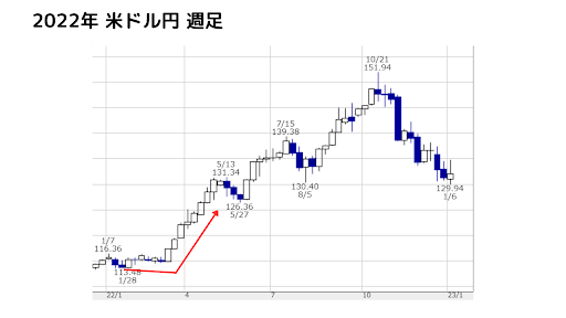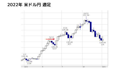 こちらは2022年の米ドル円の週足チャートです。