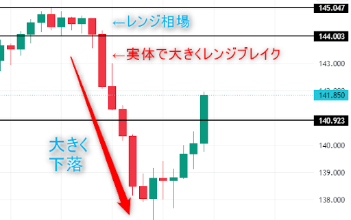 その下の黒いラインも過去に意識されていたおよそ141円のラインなのですが、これも実体の大きい陰線でブレイクしています。だからその次の日まで大きな下落が続いています。
