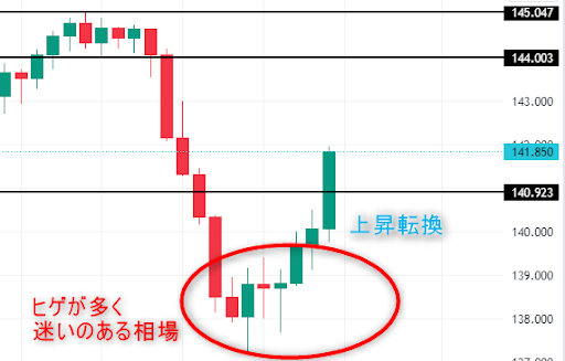 これらを踏まえると、ヒゲが少なく実態が大きいローソク足が多いときは市場が迷いなく推移していることを表していて、ヒゲの多いローソクが並んでいるときは市場参加者が迷っているということが表れていると考えることができます。