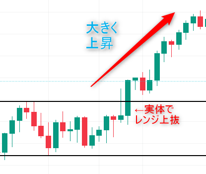 この考え方を応用すると例えば次の図のように、レンジを実体で大きく抜けた後は上昇トレンドに転換するということがイメージしやすくなります。
