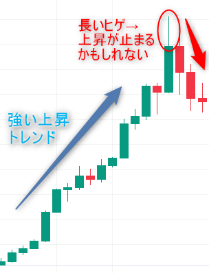 また、次の図のように、大きめのヒゲが出たときは市場に迷いが生まれたということが考えられ、強い上昇トレンドだったとしても一時的に転換する可能性があると判断できます。