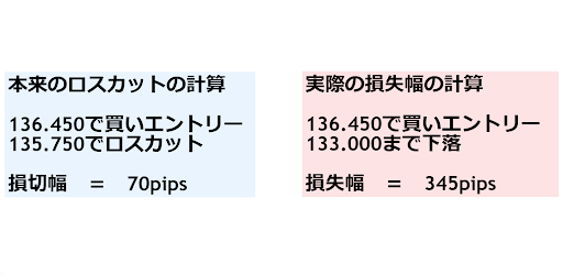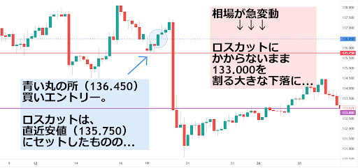 ただ、その後、相場が急変動してセットしていたロスカットにかからず、そのまま下落してしまい、最終的には133.000を割る展開になったとします。