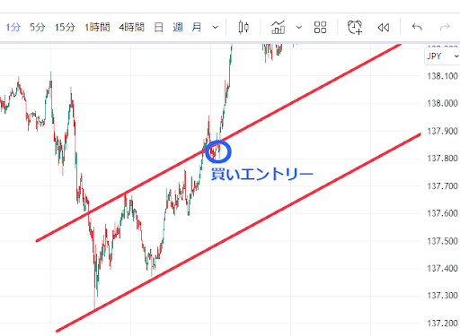 この1分足を見ていて、ラインのブレイクの後の戻りを狙って買いでエントリーの判断ができそうですよね。