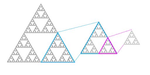 例えば、上図のように三角図形の一部を切り取ると、全体の三角図形と同じ構造が見られ、更に切り取った図形の一部を見ると、また同じ形になっている……というものです