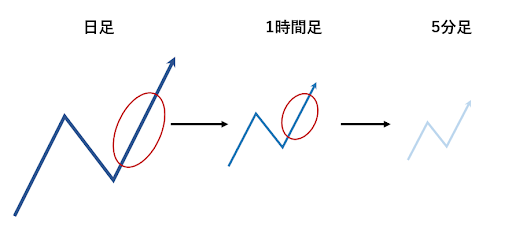 例えば、5分足が上昇トレンドだと思って買いでエントリーしたものの、より上位の1時間足が下降トレンドだった場合、一時的な小さい上昇波で仕掛けていることになり不利ですよね?