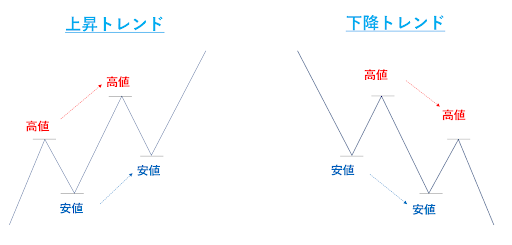 ダウ理論とは、高値と安値がそれぞれ切り上げる「N字波動の上昇トレンド」、高値と安値がそれぞれ切り下がる「逆N字波動の下降トレンド」のことです