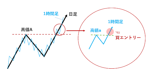 逆に上位足と下位足が同じトレンドになった時点でエントリーすることで、ダマシに遭って損切となるリスクを回避できます