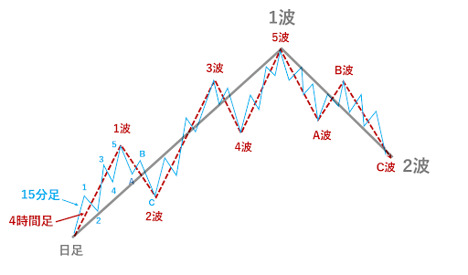 例えば、日足でエリオット波動の1波、2波を確認したとします
