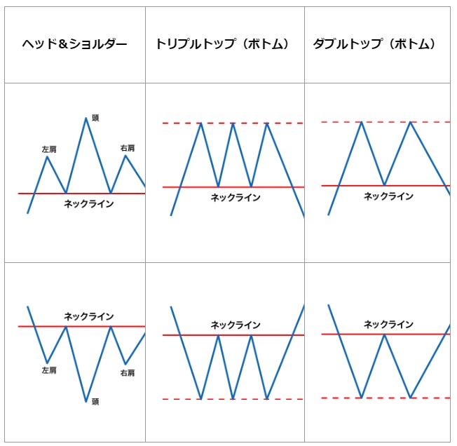 反転パターンには、ヘッド&ショルダー、トリプルトップ(ボトム)、ダブルトップ(ボトム)などがあります