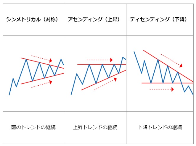 また保ち合いパターンとして、三角保ち合い(トライアングル)なども有名です