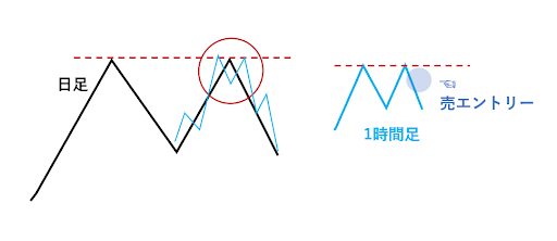 売りを狙う際には、日足チャートだけ見てエントリーするのではなく、日足に加えて1時間足チャートでダブルトップ形成を予想して売りエントリーすることで、勝率が高くなります