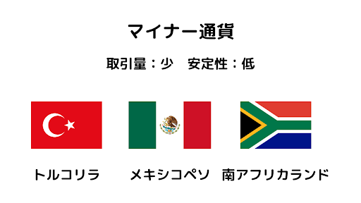 逆にマイナー通貨はメジャー通貨と比べて取引量や流動性が低い通貨で、トルコリラ、メキシコペソ、南アフリカランドなど、発行する国の安定感が低く価格も不安定な通貨が分類されます。