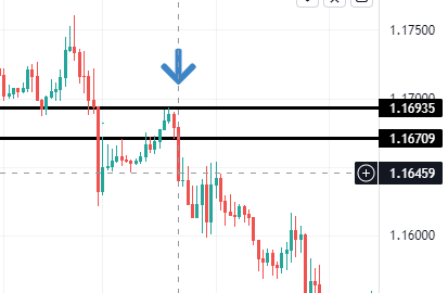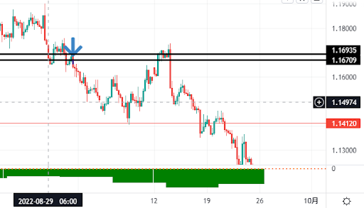 上の4時間足チャートで、下落の戻りになっているところに矢印を打ちました