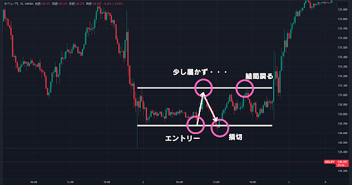 レンジ相場って教科書通り綺麗にラインで跳ね返すわけではなくて、ちょっと越えてから戻ったり、少し届かずに折り返したりで、損切貧乏になりやすいからです。