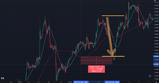 この例でも、大幅に下落してからクロスしていますね。こういう時は、クロスした後すぐに折り返しやすいのでエントリーしないようにしましょう。