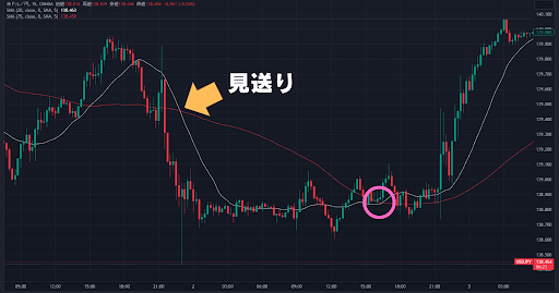 例えばここは、本来であれば買いエントリーするところですが、応用手法を使っている場合はノーエントリーで見送ります。