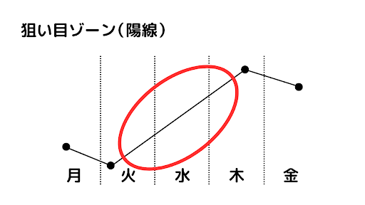 つまり先ほどの図とあわせて考えると月曜日と金曜日は値動きの方向性を判断するのが難しく、火曜日から木曜日にかけてはトレンドに乗った動きをするので方向性を判断しやすいということです。
