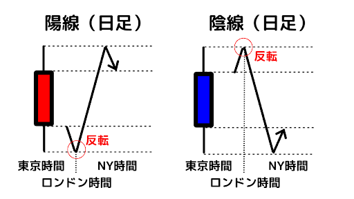 さらに日足ベースで考えると、日足が陽線であれば東京時間からロンドン時間は安値を付けにいく時間帯、ロンドン時間からNY時間は高値を付けにいく時間帯になります。