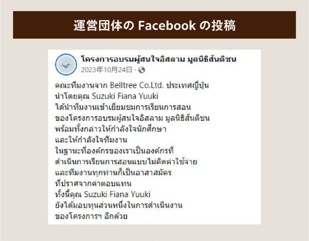 また、寄付先の運営団体のFacebookでは「フィアナ先生をリーダーとする株式会社Bell treeは、イスラム学校を訪れ、学生たちと交流しました。